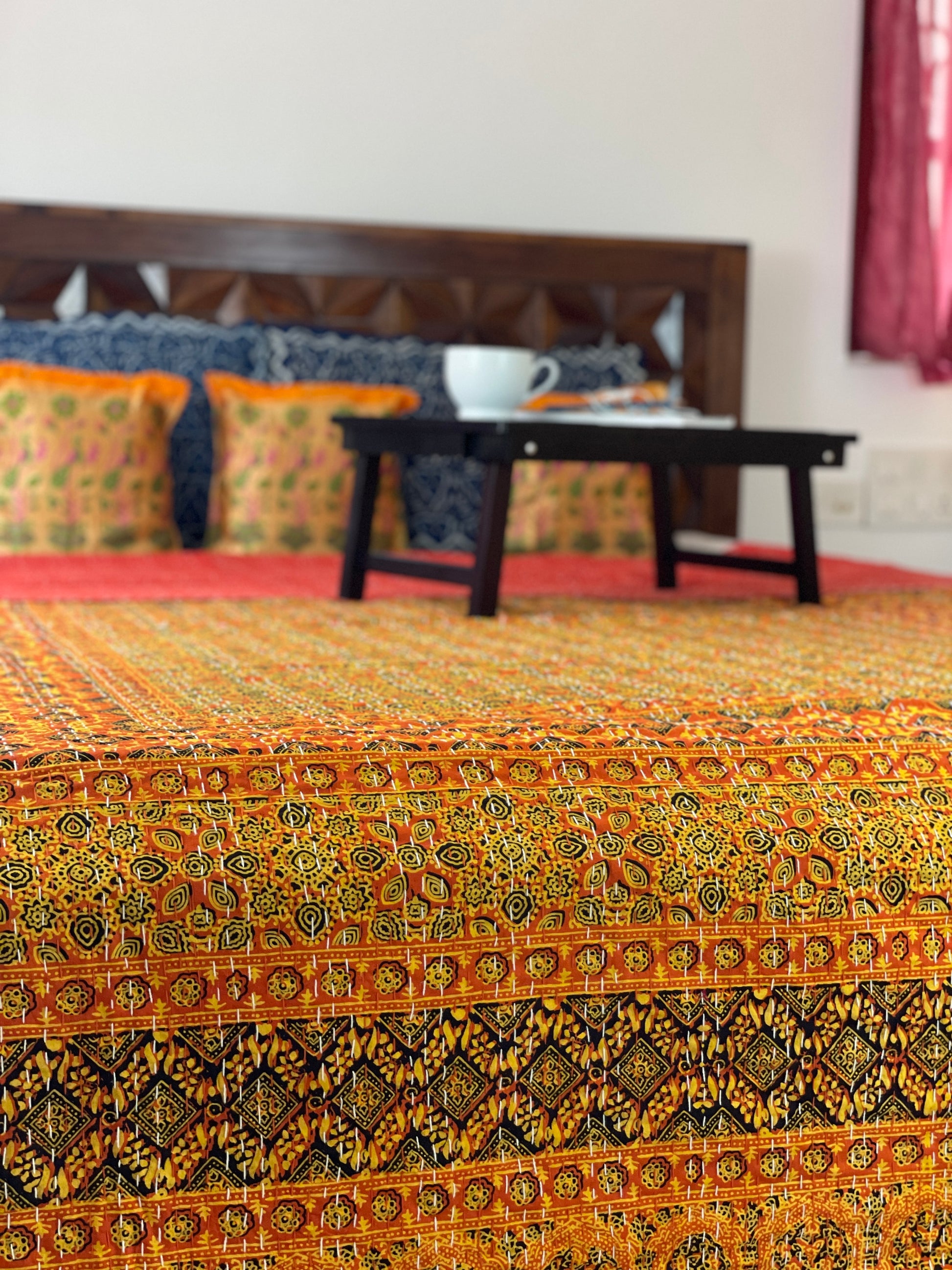 Ajrakh Handblock Printed Kantha Stitch Queen Gudri/Bed Cover - Yellow Orange